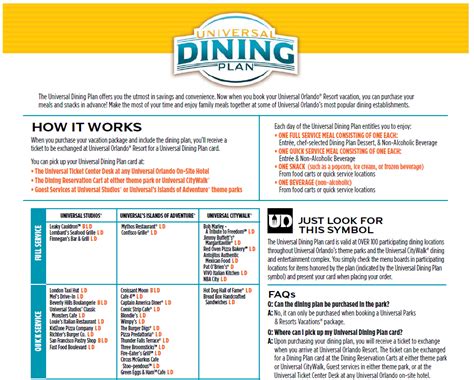 The universal dining plan quick service can be added to your universal orlando resort vacation package or simply to your theme park ticket purchase for $19.99 plus tax. When you include a universal dining plan with your vacation package purchase, you’ll receive a ticket to be exchanged for your universal dining plan card (one card per guest) at any of.